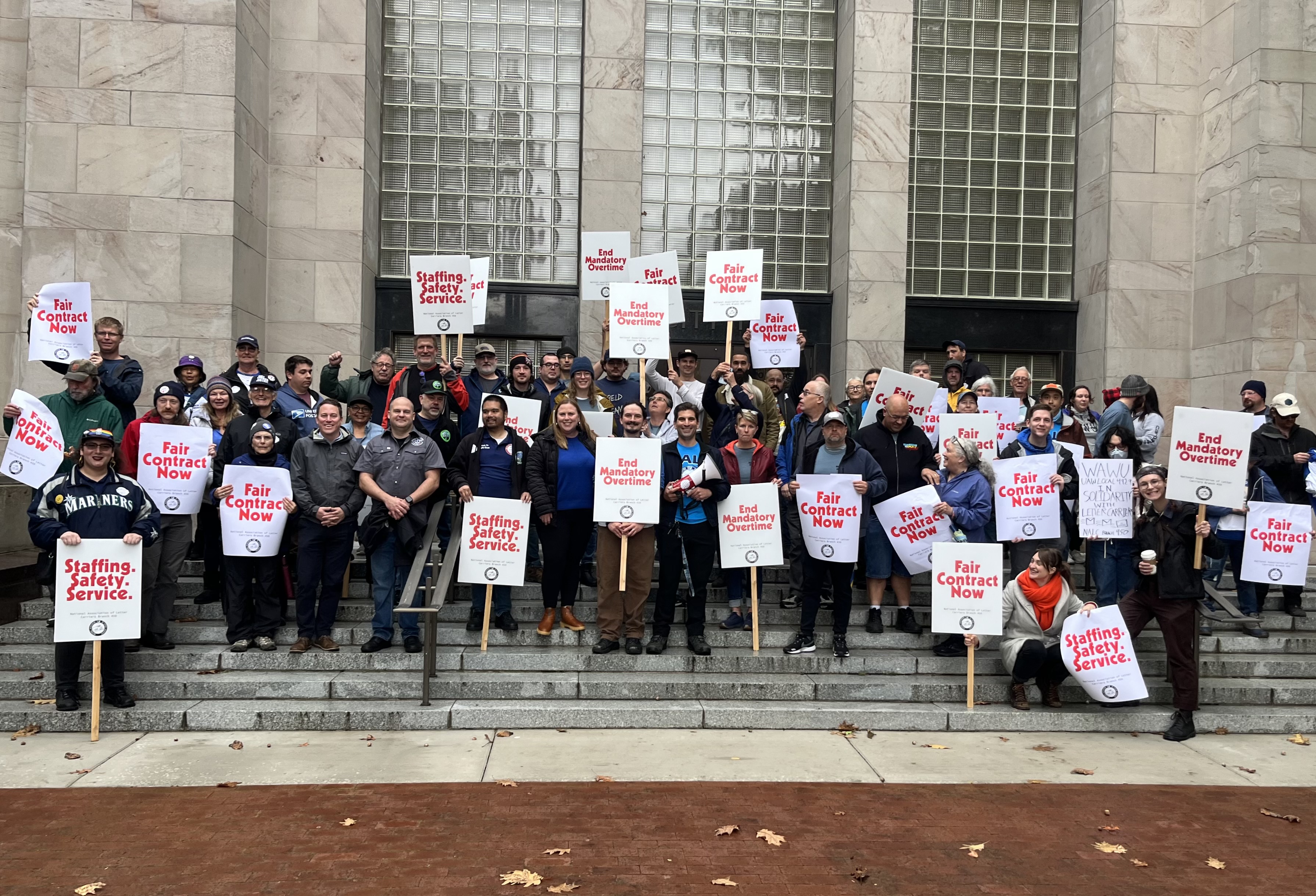 On Sunday February 22, 2026, several Whatcom/Skagit IWW GMB members showed up at the FIGHT LIKE HELL rally in solidarity with the organizers: the NorthSound 450 local of the National Association of Letter Carriers (NALC). The FIGHT LIKE HELL rally was a national effort and rallies were held by NALC locals across the country. The NALC is currently “fighting like hell” for a fair contract. You can learn more about what they’re fighting for by referencing our previous post about the event here. As negotiations continue, more NALC rallys will likely be called in the future. We’ll let you know where to show up next. Here’s a photo from the 2/22/26 event.
