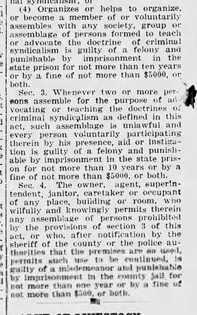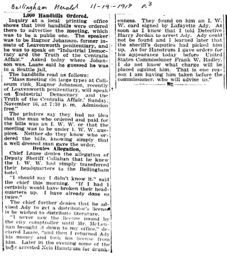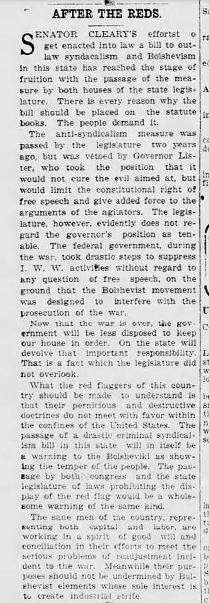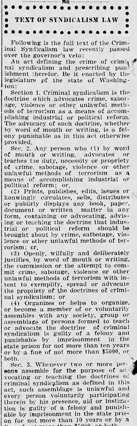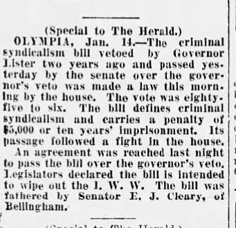 Bellingham police raided the IWW’s Lumber Workers Industrial Union Local 337 hall on November 13, 1919. Four Wobs- 26-year-old Lafayete Ady, Phillip Borchnak, and Jim Wilson, were arrested and charged under the State’s new Criminal Syndicalism law (commonly known as ‘crim syn’). These laws were used to stifle dissent and organized opposition to capitalism, and remained on the books in many states until the Supreme Court ruled against them in 1969’s Brandenburg v. Ohio. (hmmm, how would today’s SCOTUS rule?) The bill, specifically intended to criminalize membership in the IWW, was introduced in 1917 by Senator E. J. Cleary of Bellingham. Though it passed the legislature, Governor Lister vetoed it as an a infringement of free speech. The veto was overridden and the law was passed on January 13, 1919. The rabidly conservative Bellingham Herald gushed with praise- the paper editorialized often on the ‘evils’ of the ‘un-American’ ‘Bolsheviki’ of the IWW . The text of the law as published in the January 21 1919 Herald follows the article on the veto override.