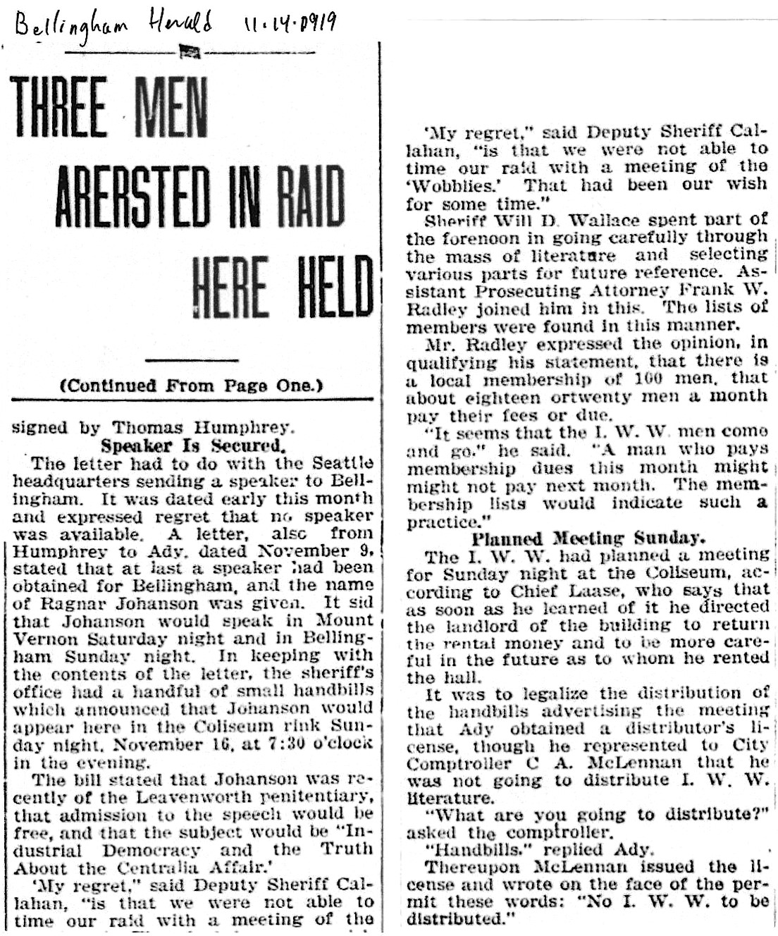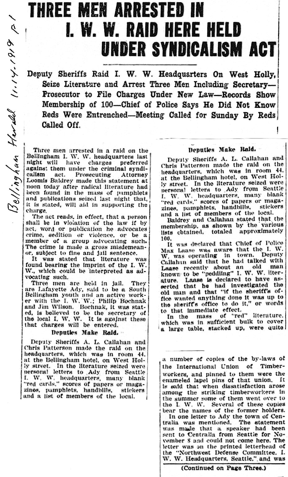 The city prosecutors dilly dallied until the following November to do anything with the new law. The union hall of the IWW’s Lumber Workers Industrial Union Local 337 was raided on November 13. Three Wobblies were arrested and charged with criminal syndicalism, the first time the law was used in the state. We will let the Herald tell the story because the IWW’s own press had been shut down as a result of the Centralia Tragedy of November 11- just two days before the raid on the Bellingham union hall.