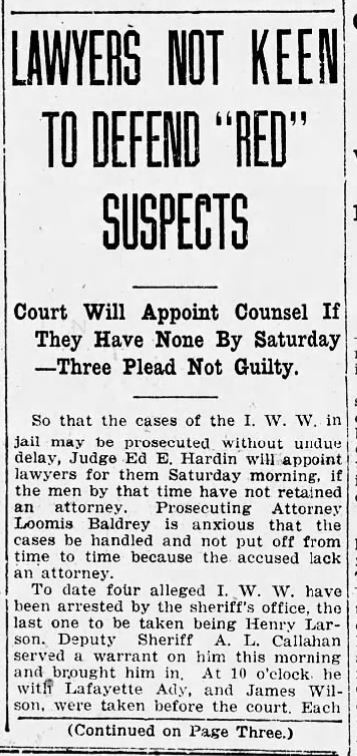 The prosecuting attorneys were Loomis Baldrey and Frank Radley. The State Attorney General L. L. Thompson, a staunch opponent of the IWW and radicalism of any stripe, attended the entire trial and exercised his right to assist the prosecution. Local attorneys refused to defend the men. The judge, Ed E. Hardin, appointed two local attorneys, Charles B. Sampley and A. C. Durham. Understandably mistrustful, Fellow Worker Larson said ‘no thanks’ and tried to represent himself, claiming he had once practiced law in Illinois. The judge denied him this right. It proved difficult to empanel a jury- many potential jurors were dismissed by motions of both the prosecution and the defense.