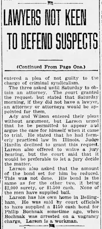On November 20, the home of a fourth IWW, Henry Larson, was raided. He was arrested and charged under the crim syn law. FW Larson appears to have been a member since the earliest days of the union. In 1909 he was listed in Industrial Worker as the original Secretary of Local 337, chartered in 1909, and he had reportedly been at the 1886 Haymarket 8-hour-day protests in Chicago.