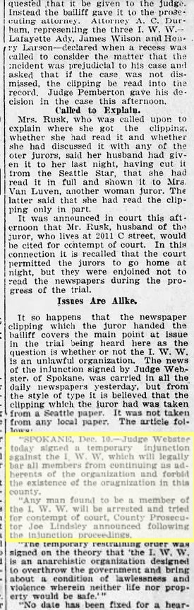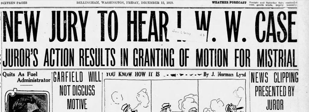 The trial got underway on December 9, 1919. However, on Dec 12 a juror showed a newspaper article reporting a Spokane judge’s injunction against membership in the IWW in Spokane, the principal point in the prosecutions case against the Bellingham Wobs. This was strictly forbidden, and the judge was forced to declare a mistrial.