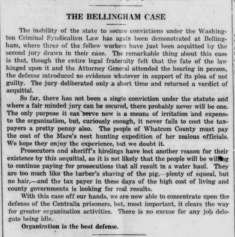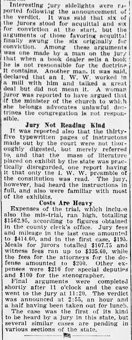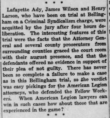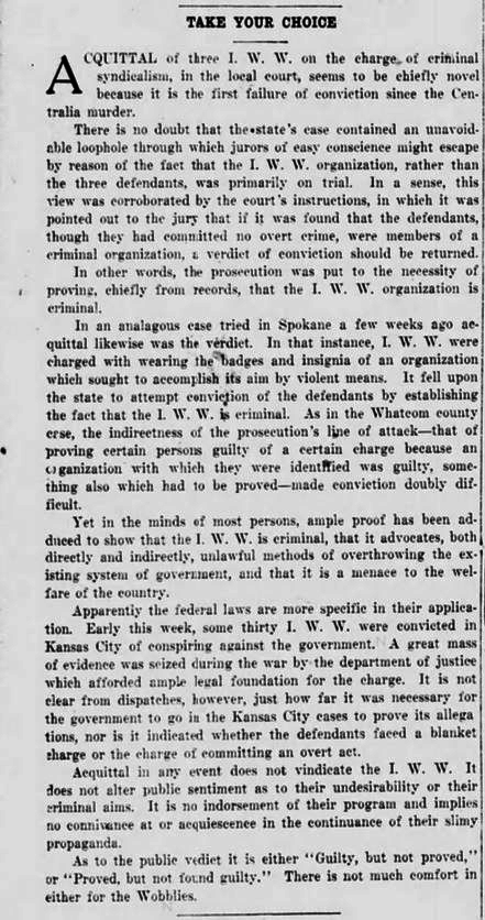 Both the Bellingham Herald and the IWW’s own Industrial Worker editorialized on the acquittal, taking radically different views.