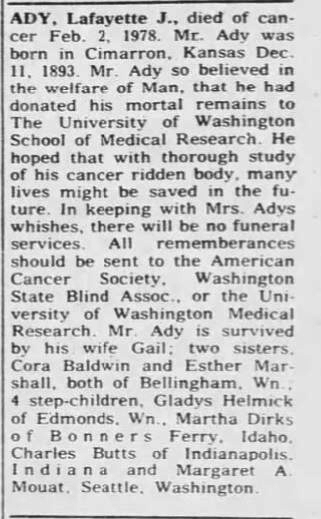 What happened to these men? FWs Ady, Larson, and Wilson were released. Poor FW Bochnak must have kicked himself, as he spent the next two years in the county poor farm working off his fine. So far, I haven’t dug up much about any of them except Lafayette Ady, who continued as an IWW delegate. He was arrested many times in Bellingham for selling IWW literature without a permit, and was fined and spent time in jail or on the county ‘work crew’. He was a thorn in the side of the city government, advocating at city and county council meetings for workers rights and better conditions for workers sentenced to the work crew. He joined the Communist party at some point and filed to run as a Communist for the 2nd US Congressional District, but I can’t find any election results mentioning him. He was the Communist candidate for Bellingham mayor in 1931, but all the Communist candidates for city positions were ruled ineligible due to giving ‘improper notice’ of his filing. He died in 1978 in Everett.